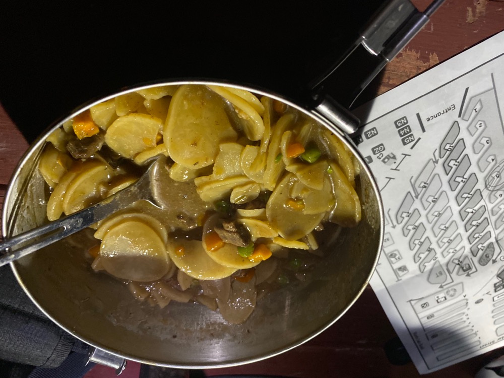 Once back on the Highway I wick it up a tad, The rig settles into a nice 105k It is now getting late but we still have light till almost 8:00 so Blue River is in the cards. I pull into the campground at dusk hoping for a spot. No issues. Of course I have the new Redverz Solo tent which I have only set up once. My spot is a tad small and the tent is a tad large. Not sure I have made the right choicer a new tent, Err I mean Kathy made the right choice for a Xmas present. Once things are set up it is dark, so no pictures of my first camp, But I did cook up a reasonable freeze dried stew