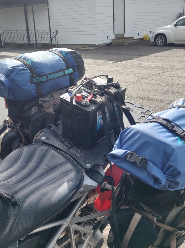 Fortunately for David there was a chap in Dease Lake who not only helped diagnose the problen as a dead stator (following directions from David's trusted mechanic back in the US) but who was also able to set him up with a used NAPA Marine starting battery and a set of heavy gauge cables with eyelets at each end such that he could connect the big battery in parallel with the bike's battery. The bike was content but of course the big battery has to be recharged periodically.