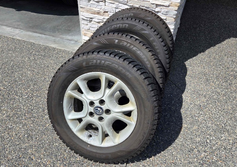 These tires were on our 2015 RAV4 which we recently traded in. The tires are Laufenn Fit Ice, 225/65 R17 102T. The tires have only 8,000 kms and a tread depth of 9mm. The wheels are Toyota H17 x 6-1/2 J, 45mm offset, 5 x 114.3, 60.1mm center bore. The paint is peeling on the wheels but they are undamaged and sound. Located in Kelowna.